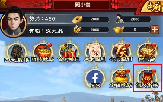 | 系統 | 官品 | 勢力 | 成就 | 道具 | 每日任務 | 主線任務 | 七日福利 | 一鍵功能 | 重歸仕途 | 版本更新 |