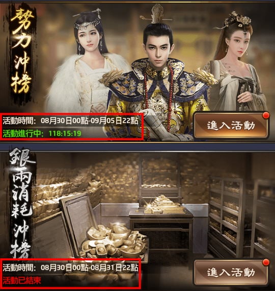因為剛結束衝榜時,晚上10點~凌晨12點這2個小時之間,是完全沒有任何「限時獎勵」的,這段時間你花銀兩升級門客、加紅顏親密、用強化卷軸等動作,都是浪費,不如等過12點後,看是哪種衝榜,在決定要做什麼動作。