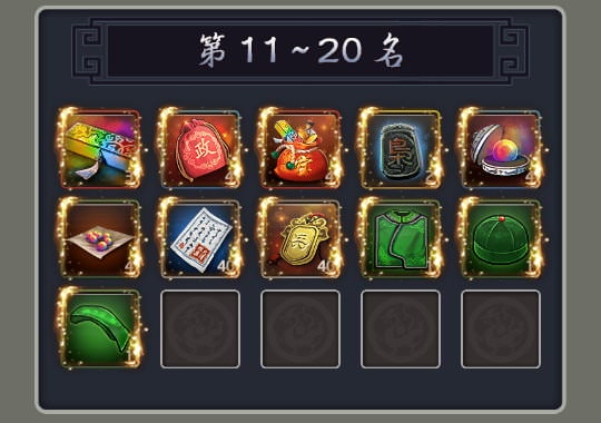 這遊戲的獎勵層級落差掉的非常快,舉例來說,第1名能拿到36套「綠衣」,但第11名後就只剩1套。或第1名能拿到10個招募令,但第21名後只剩1個,也就是第21名~第100名的玩家,得衝榜10次才能拿到10個招募令來兌換門客,這在遊戲中會形成非常大的差距。