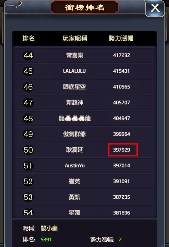 但是要注意到老玩家通常會在最後一刻(晚上9點50幾分時)才大量丟資源去衝刺,另外40幾名~50名的玩家會不想掉出榜單,而50幾名的也會奮力一搏,通常都會盯著榜單看,硬擠出資源來維持名次,故不要抓得太剛好,很容易發生意外。衝榜過幾次後,大概都能知道自己會落在哪個層級。