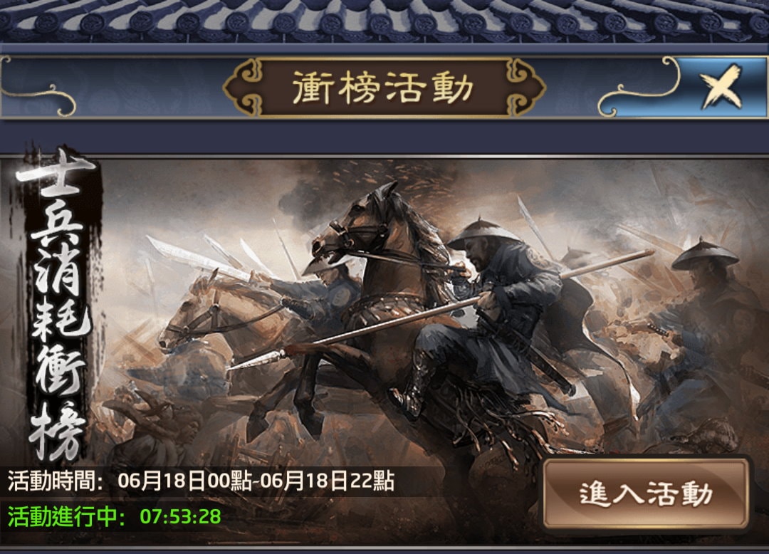 士兵消耗衝榜是以「消耗士兵」為競賽內容,是以「個人」為競賽對象,幾乎都是搭配「關卡衝榜」一起出現,跟關卡衝榜一樣,活動日數通常為1天。