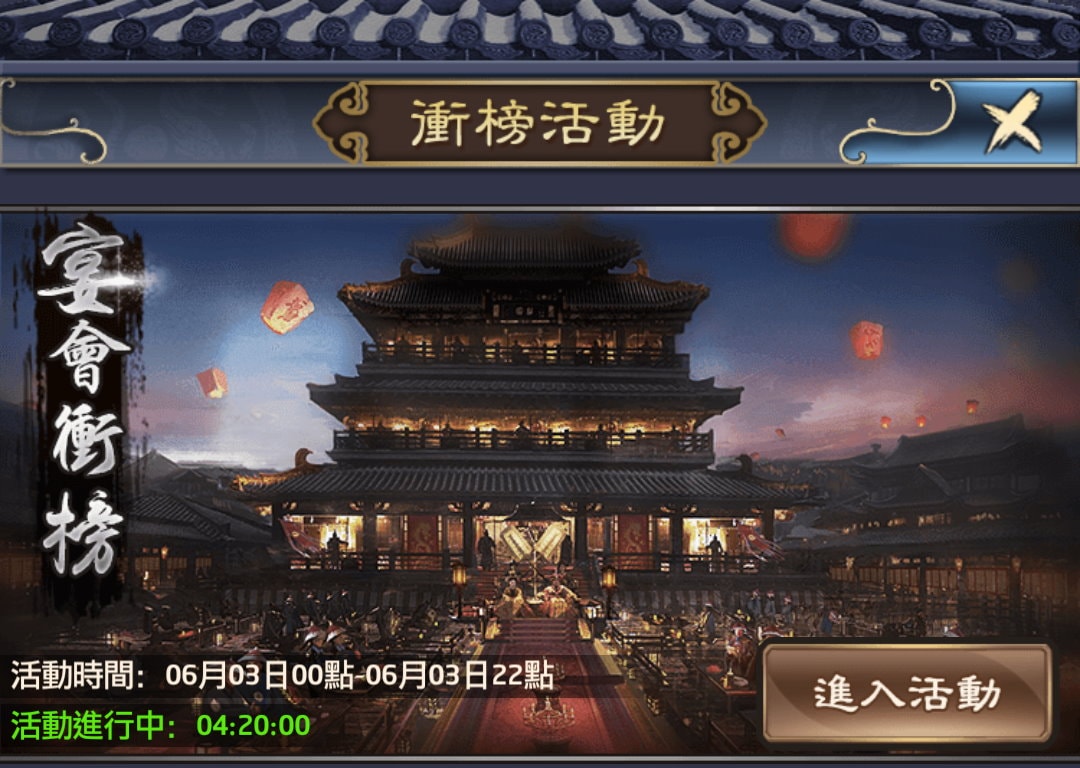 宴會衝榜是指玩家在「酒樓」開宴會,其他玩家派門客來吃宴,而參加宴會門客的屬性總和越高,就能得到越多宴會分數,衝榜就是比這段時間內的宴會分數漲幅。