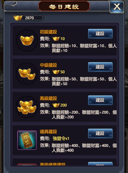 若是有充值,有「強盟令」道具的玩家,最好把道具留到「聯盟經驗衝榜」時再用。另外每個成員每日只能建設一次,若無充值沒什麼機會拿到強盟令,在聯盟經驗衝榜時期至少要高建。