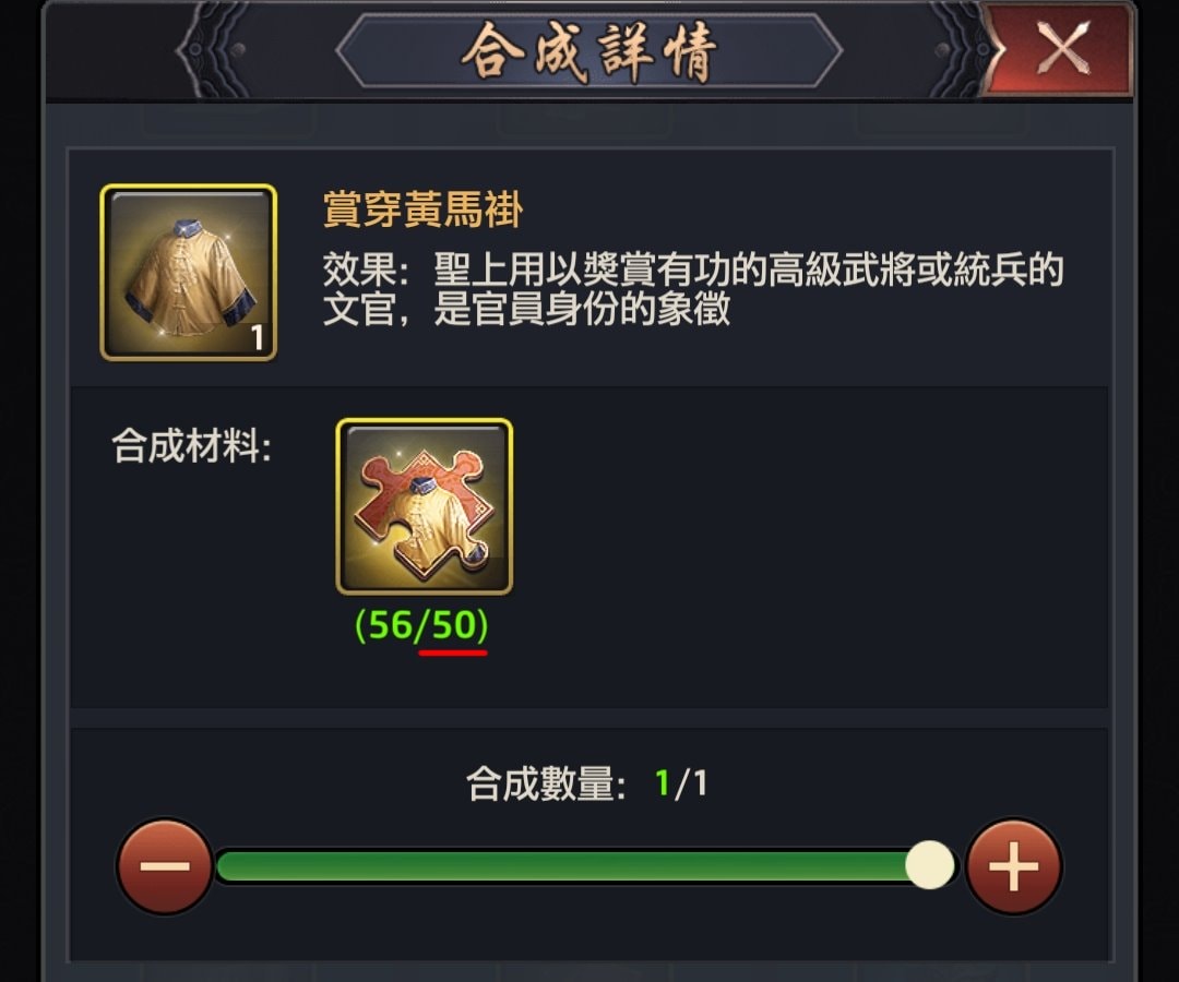 答案:我在門客身上穿著2星賞穿黃馬掛的狀況下,又從三藩那獲得一件1星賞穿黃馬掛,當我把2星賞穿黃馬掛脫下後,得等30天才能再度裝備。