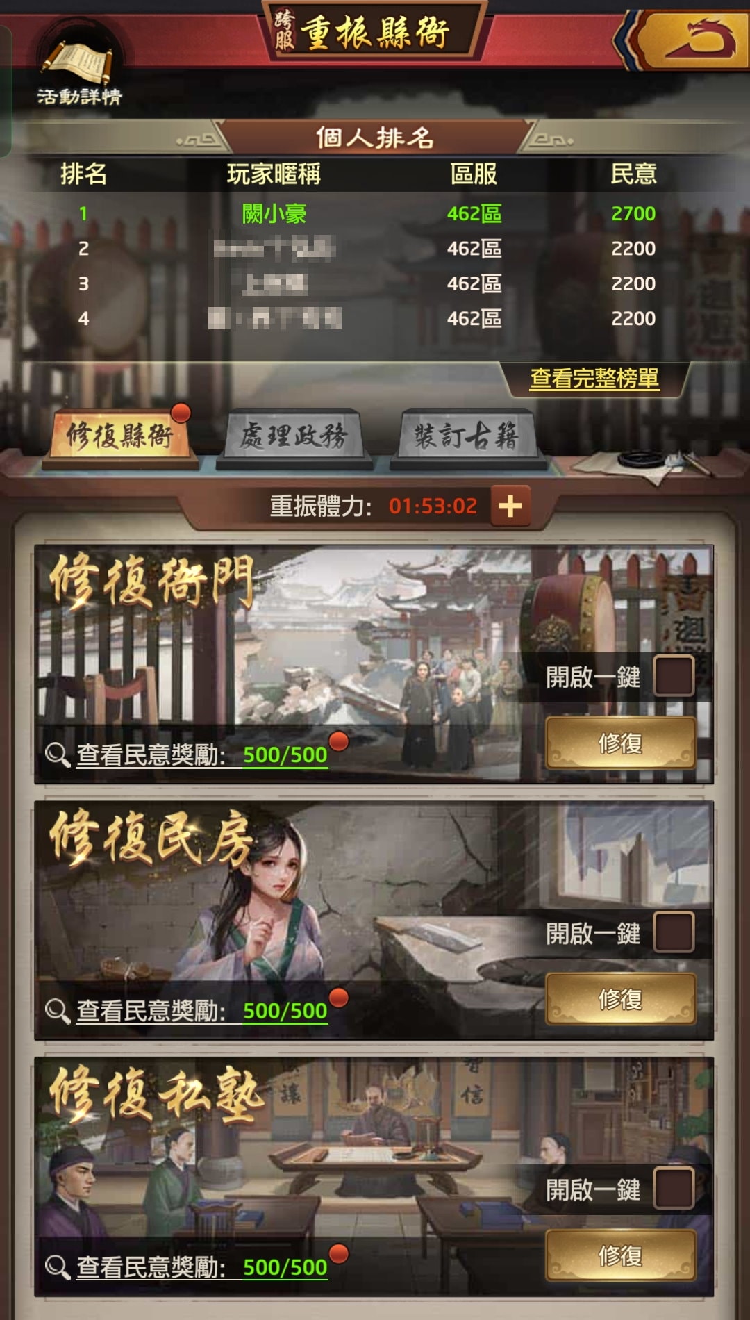 - 擁有資格的玩家方可參與本次活動,通過消耗一點體力開啟一次重振縣衙的玩法獲取民意值,最終根據民意值排名。