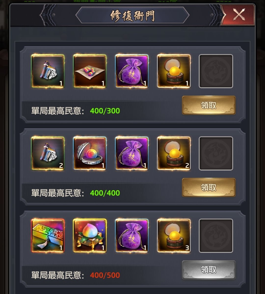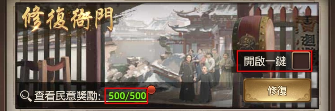| 單局最高民意 | 修復衙門(3小關) | 處理政務(3小關) | 裝訂古籍(3小關) |