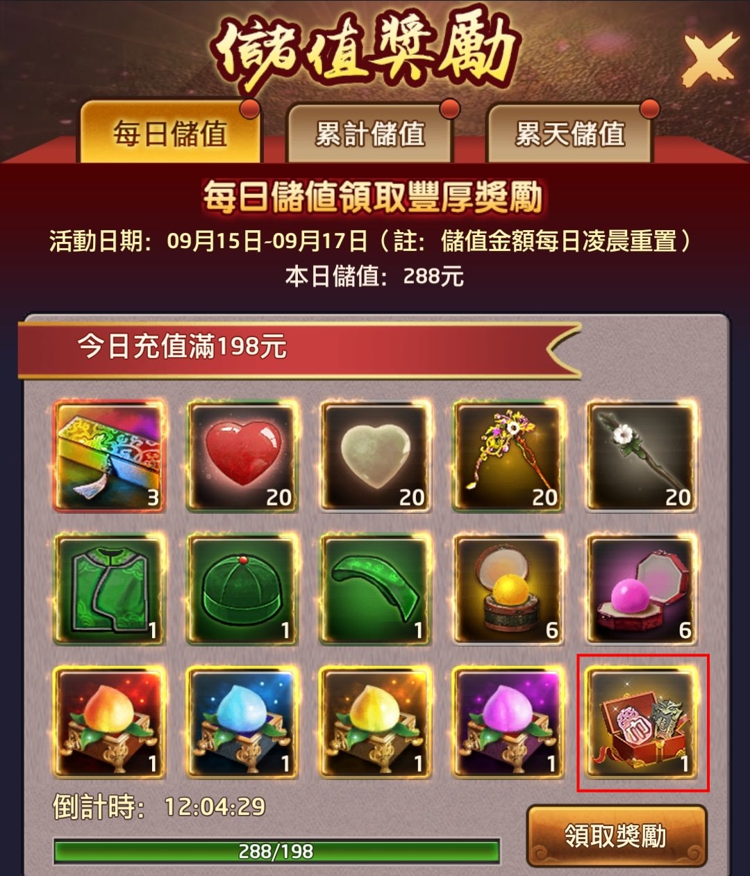 儲值獎勵每次都不同,原則上都要198人民幣起跳,可獲得烏龍禮盒:巾幗*1