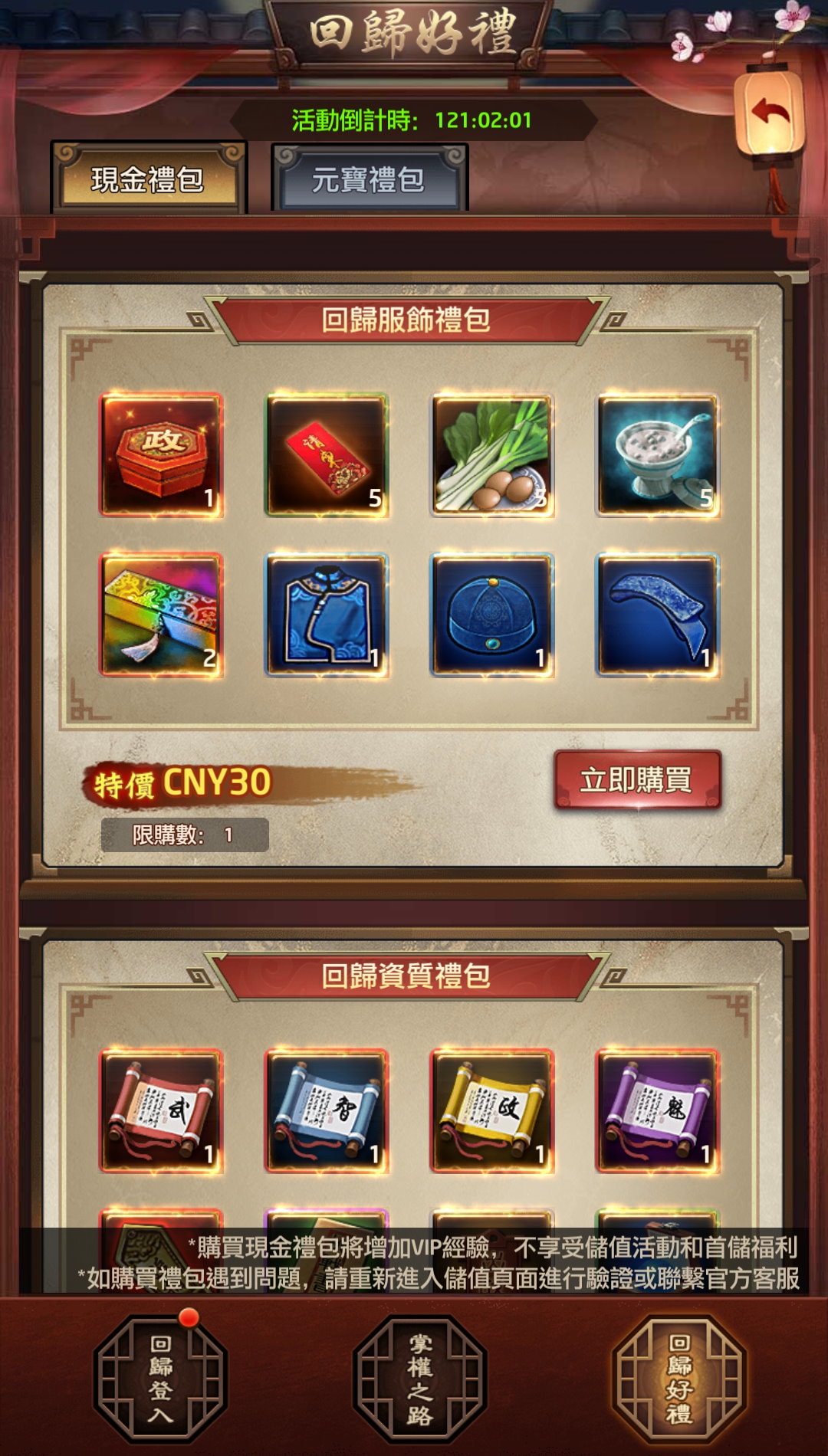| 第1天 | 書籍經驗包*2、技能經驗包*2、百寶袋*2、武力強化卷軸*1、卷軸禮包*2 |