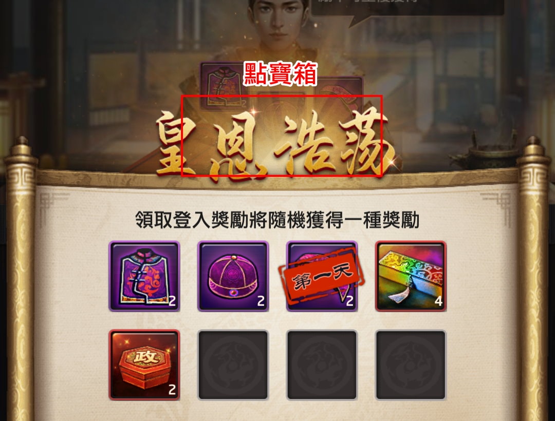 點擊寶箱(皇恩浩蕩)每天可隨機得到一種獎勵,這個獎勵跟你離開遊戲的天數有關: