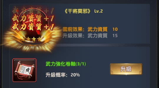 我自己在227服的狀況(總覺的這服的運勢很差或機率特別低),充值到 VIP 1前七天勢力衝榜時約拿到12個武力卷軸,都賭在干將的5星書籍上,但只成功一次,只能靠「書籍經驗包」硬撐把干將武力資質衝上去,關卡跟副本打不動,連帶整體發展都超不順。