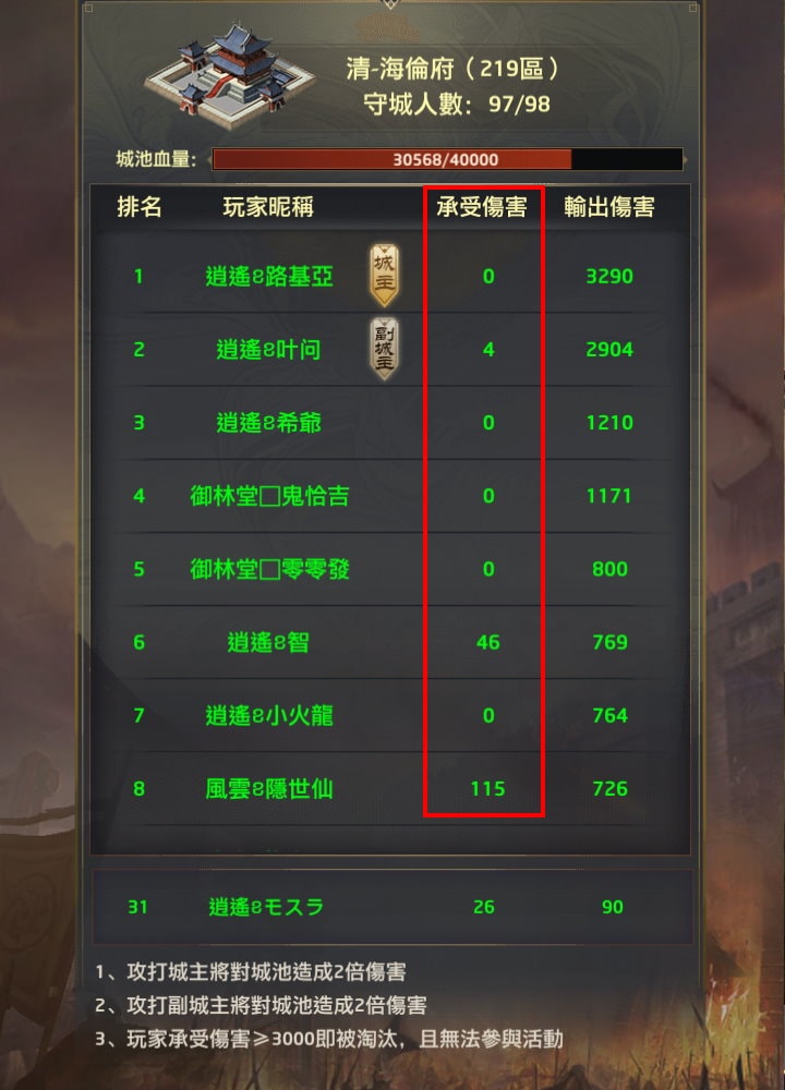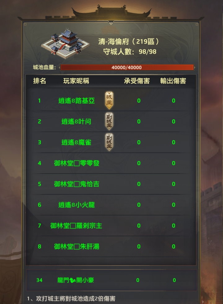 參賽玩家會以衙門型態對戰,城池內的玩家每被擊敗1名門客就扣1滴血(在幾個特定條件下會扣2倍傷害),每個玩家被扣多少分會加總紀錄在「承受傷害」欄位,