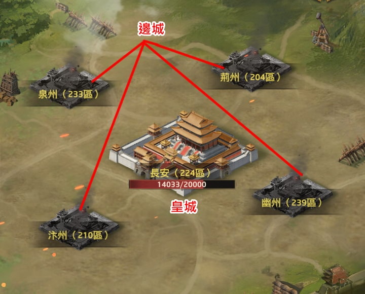 勢力爭霸賽第1名區服的玩家會待在「皇城」,第2~5名區服的玩家,也是以區服為單位,分別待在四個「邊城」。