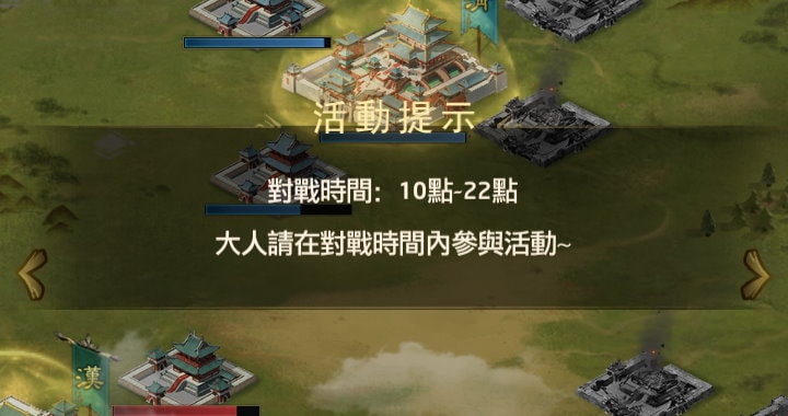 - 逐鹿中原活動時間為早上10點到晚上10點,這部份跟「衙門爭霸賽」不同,衙門爭霸賽開啟後就會持續打到活動結束,中間沒有休息時間。