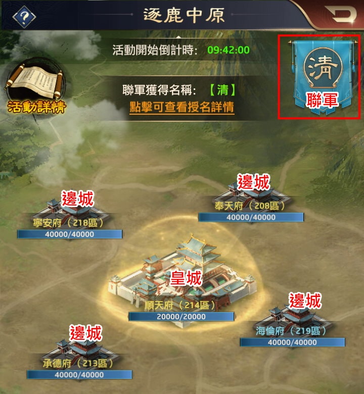在勢力爭霸賽中脫穎而出的5個區服,系統會把你們組成一個「聯軍」,聯軍的名稱都是歷史朝代:夏、商、秦、漢、隋、唐、宋、元、明、清,共有10個,由統帥選出一個,先選先贏,每個朝代會有對應朝代名稱的城池: