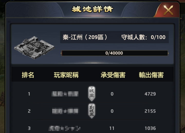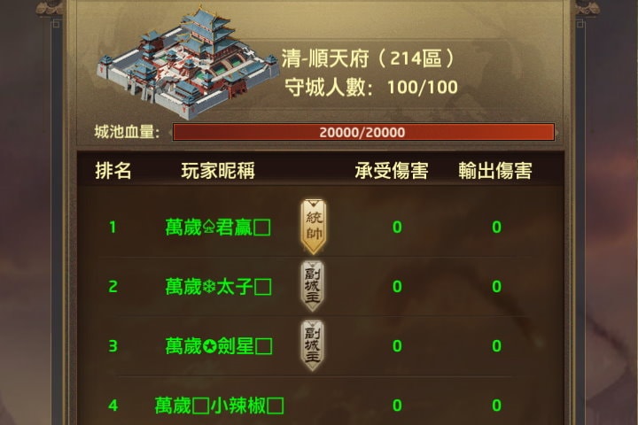 點擊某個城池後,可以看見該城有多少守城人數,通常都是100名,也就是該區服「參加勢力爭霸賽的100名玩家」,沒領勢力爭霸賽門票,就不會出現在名單上。主城會有1名統帥、2名副城主,邊城有1名城主、2名副城主。