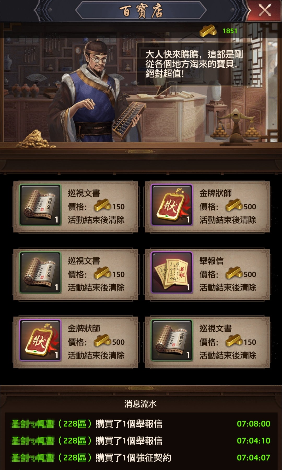 走到「百寶店」後可以購買道具,這些道具是用活動中的「資金」購買而非「元寶」購買,無須擔心。