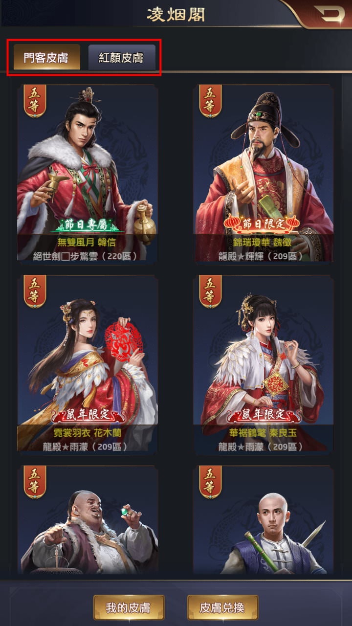 凌煙閣這邊能看到遊戲中所有的皮膚,分兩大類:門客皮膚、紅顏皮膚