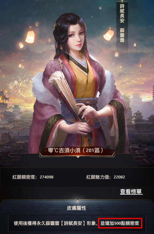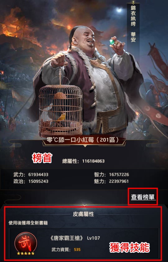 點「查看榜單」後會秀出「擁有這個皮膚的玩家」的排名,譬如說華安是所有玩家都有的,但只要沒兌換過「錦衣紈絝」,就算總屬性再高,也不會出現在榜單上。