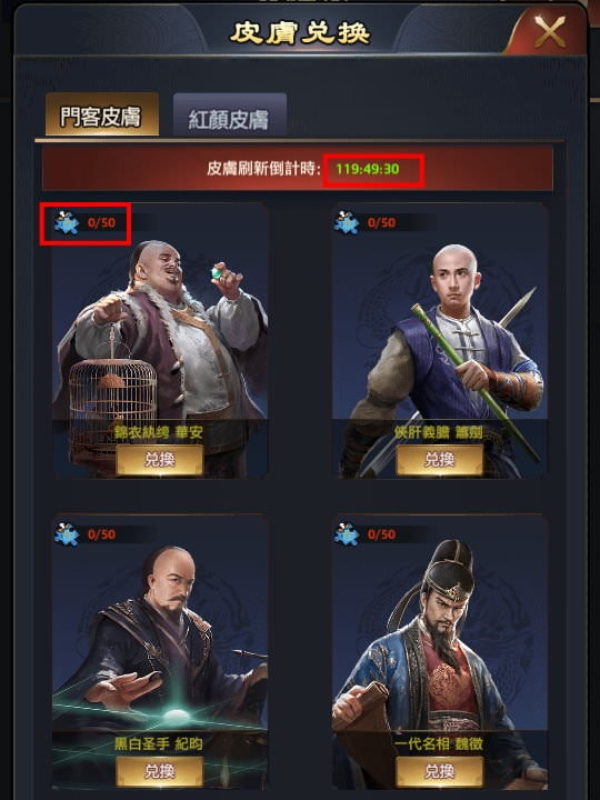 每次會隨機推出4個皮膚,每72小時(3天)更新一次,收集50個「門客皮膚碎片」可以兌換1個「門客皮膚」。