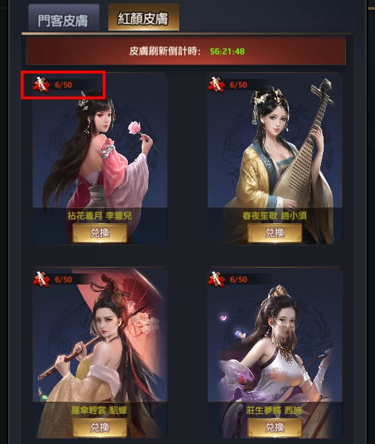 紅顏皮膚同樣一次推出4個,收集50個「紅顏皮膚碎片」可以兌換1個「紅顏皮膚」,獲得皮膚的主要管道是「一品名魁」,與該時期的衝榜獎勵、充值獎勵、限時獎勵。