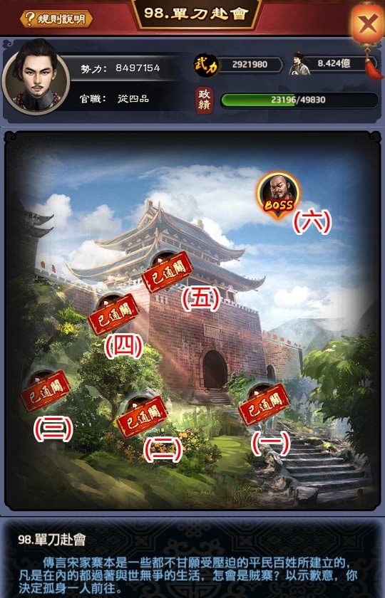 第6個章節是BOSS關,每個門客每天都能上場打一次,使用「出戰令」能讓出戰過的門客再上場一次,但一位一天僅限使用一次出戰令。(跟聯盟副本打殭屍或副本打噶爾丹規則都一樣)