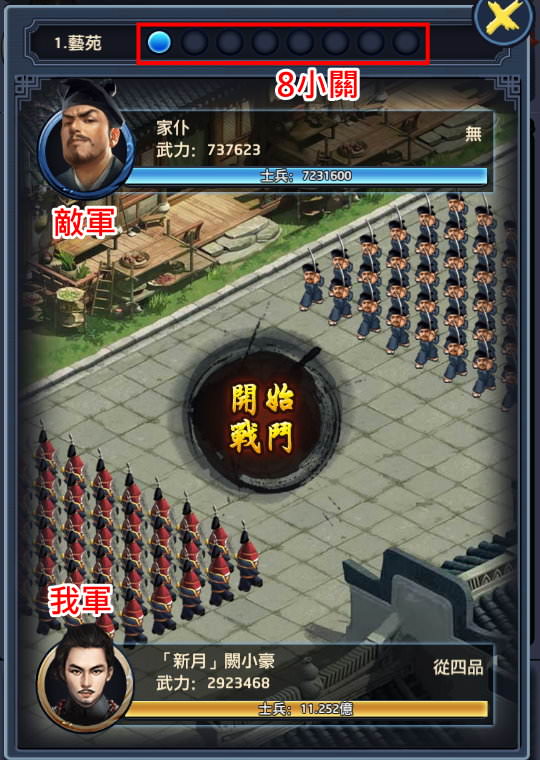 前面5個章節,每個章節各有8小關,打關卡時,「總武力屬性」越高,消耗的士兵就越少。