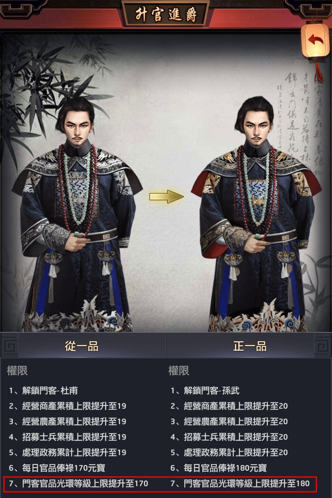 之所以會稱為官品光環,是因為官品決定了等級的上限。這在「升官」介面能看到。
