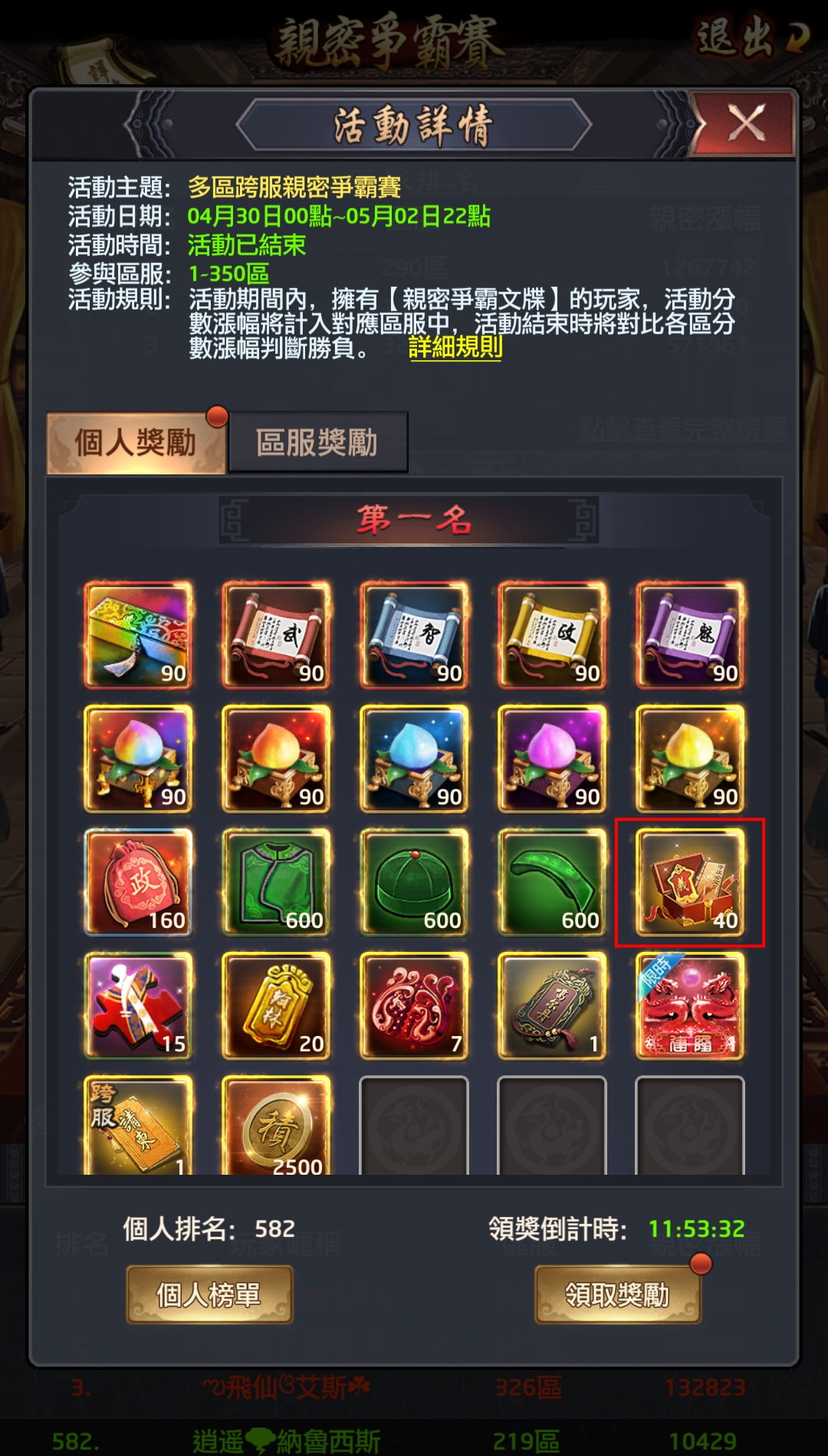 | 15 | 孝莊金寶*(滿級) | 全屬性+30% |