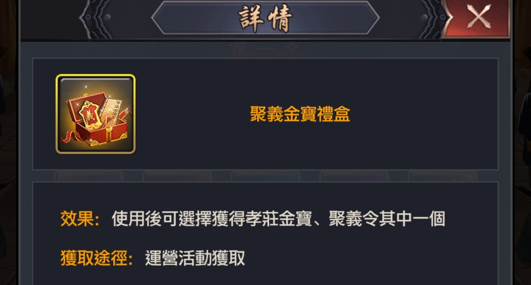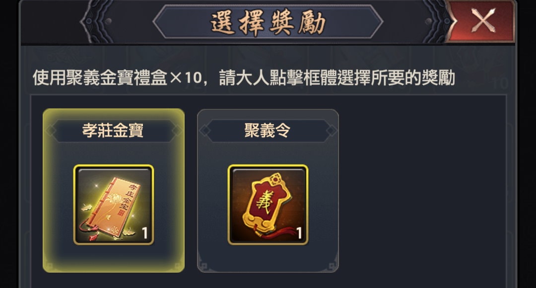 使用道具「聚義金寶禮盒」後,可以選擇要「孝莊金寶」或「聚義令」。(點擊圖片以外的地方使其呈現淡黃色選取狀態)