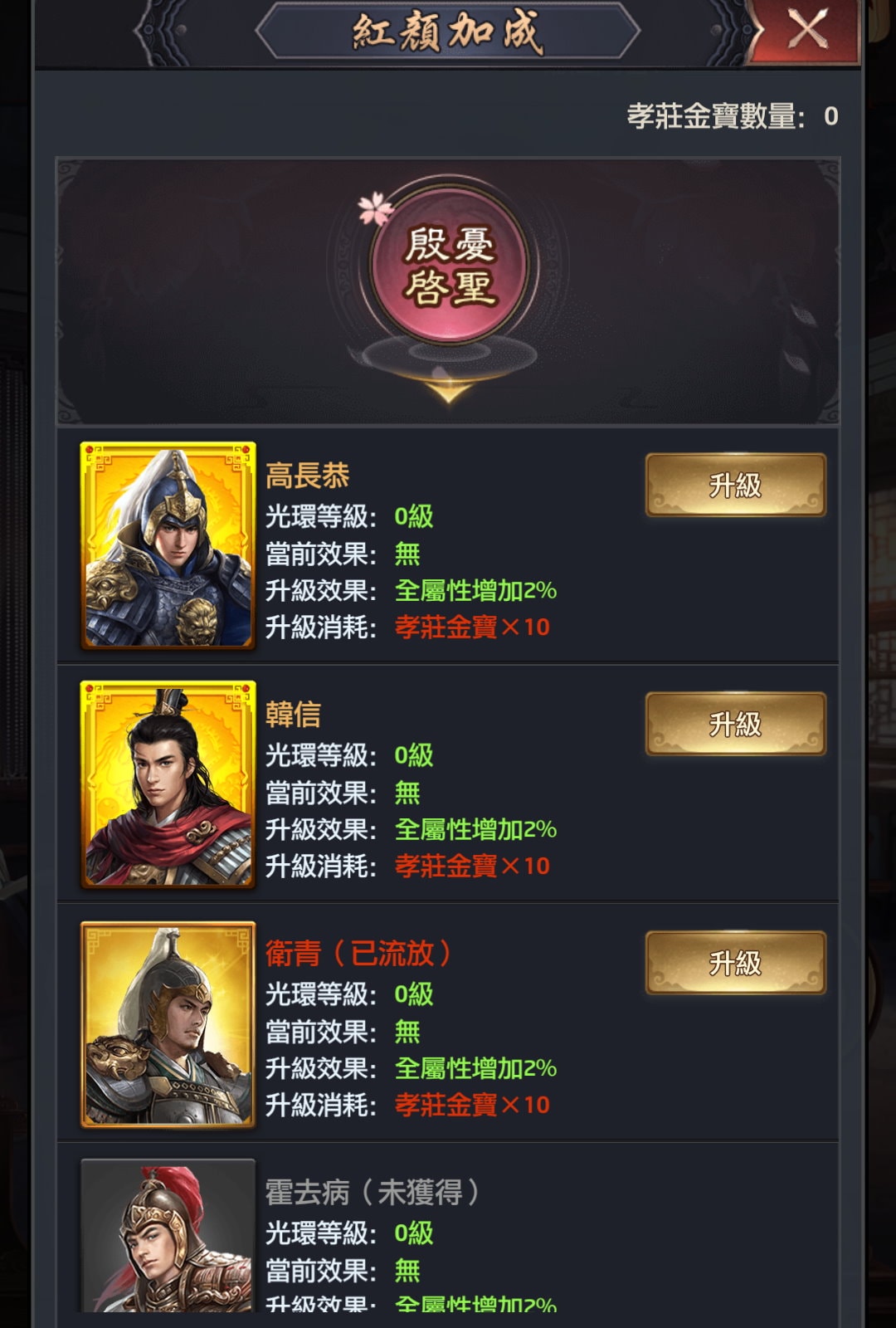 | 孝莊 | 孝莊金寶*10 | 殷憂啟聖 | 全屬性+30% |