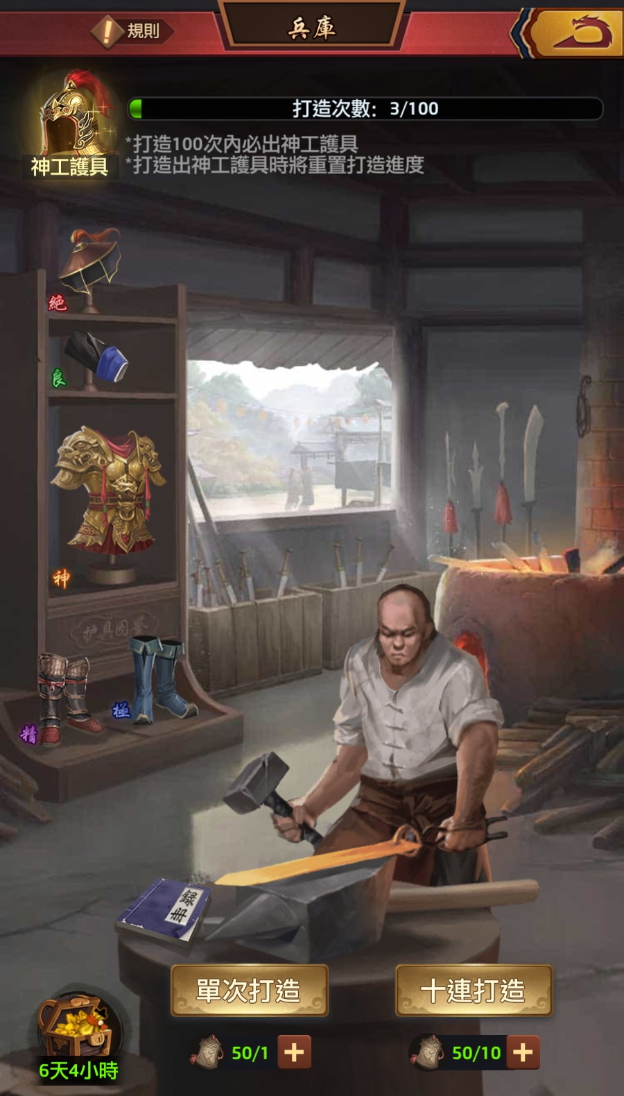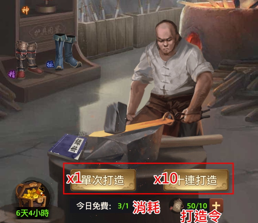 在「兵庫」中可以打造「護具」,每天可免費打造3次,此外要消耗「打造令」,若數量不足也可以用「100元寶/1個」購買。