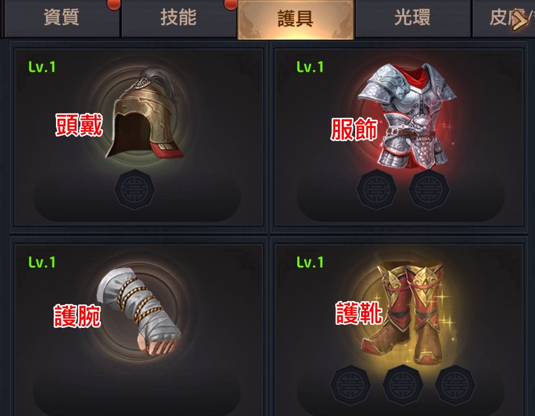 護具有分四個部位:頭戴、服飾、護腕、護靴,意思是每位門客身上最多可以裝備4件護具。