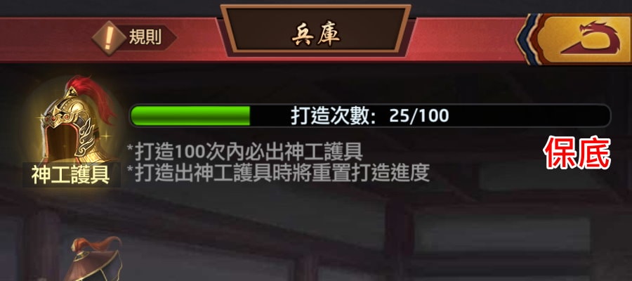 保底機制:連續打造失敗99次時,第100次一定是「神工」品級。但如果中途有靠隨機出現神工,則次數歸0重新計算。