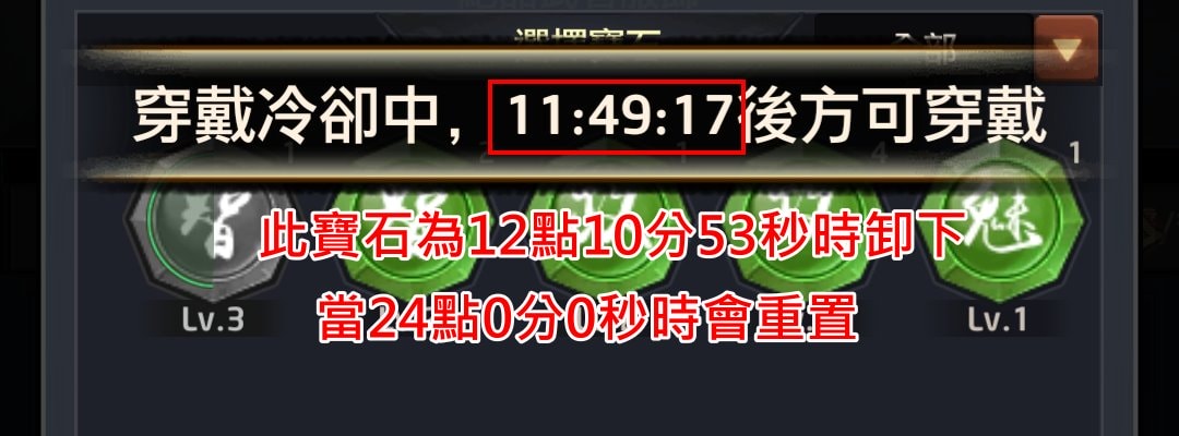 卸下寶石的「冷卻時間」是「凌晨24:00重置」,不管你是在哪個時間點,00:01 或是 23:59 卸下,都得等到 24:00,才能重新裝上。