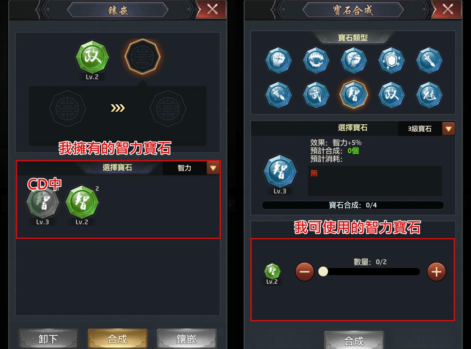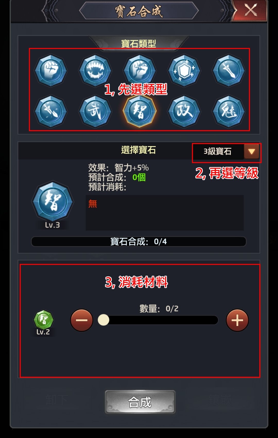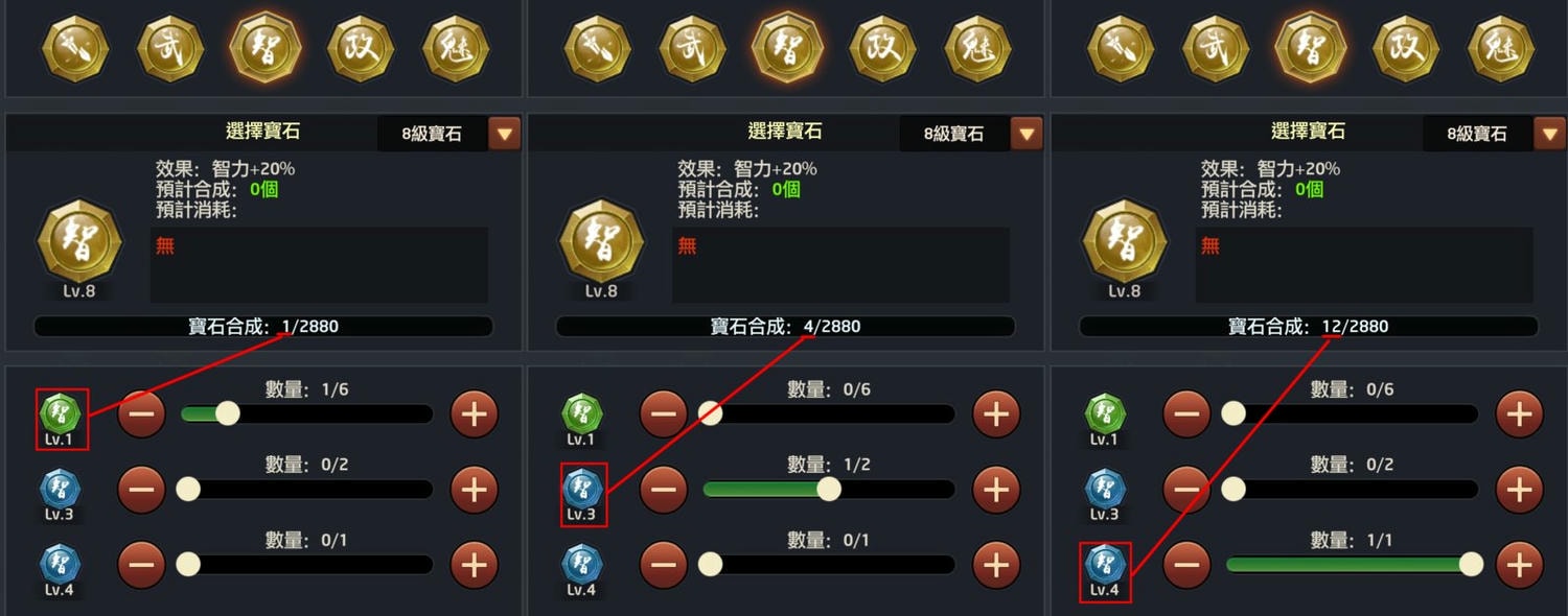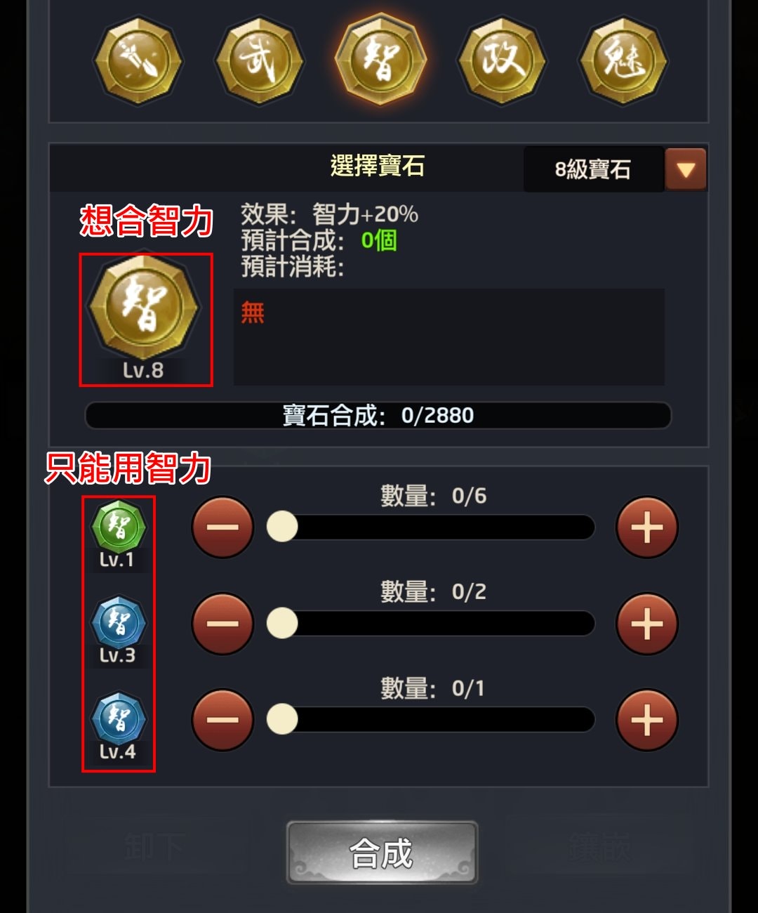 必須同一種寶石才能合成,武力只能跟武力合成、智力只能跟智力合成、暴擊概率只能跟暴擊概率合成,依此類推。