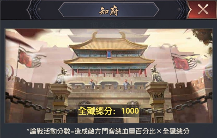 - 例如論戰【知府】玩家時,活動得分 = 當前造成敵方門客總血量傷害百分比 × 1,000