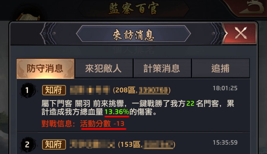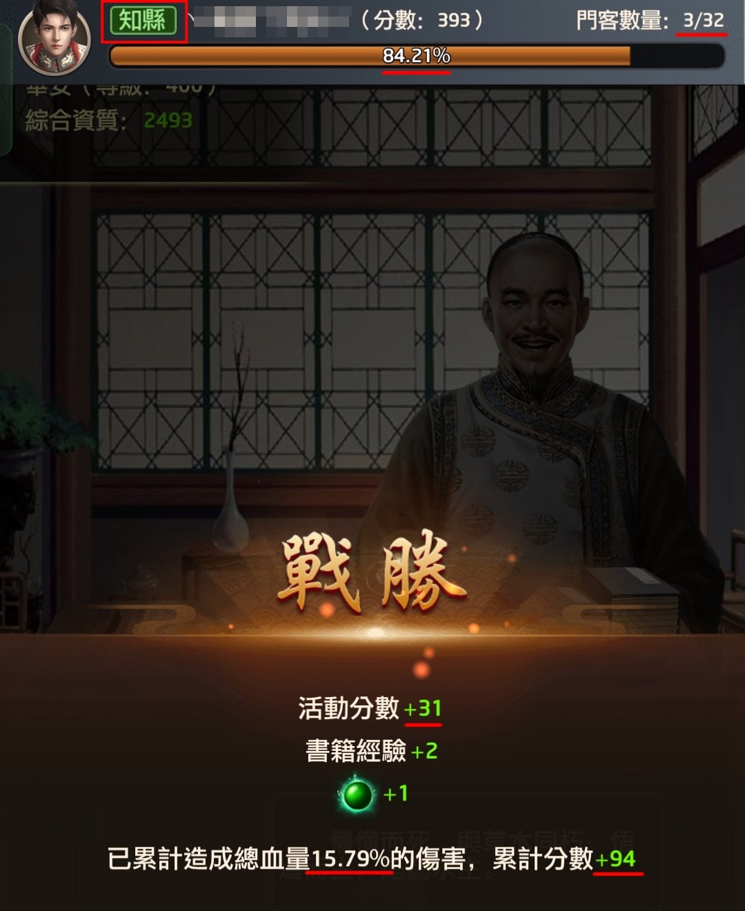 防守方就沒有分頭銜,不管是知府、知州、知縣,門客被全殲就是扣100分,若沒全殲則是依照百分比 × 100來計分。