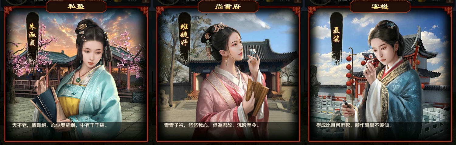 | 府宅 | 門客 | 紅顏 | 子嗣 | 聯姻 | 遊學 | 宗祠 | 奇珍閣 | 官府(京城) |