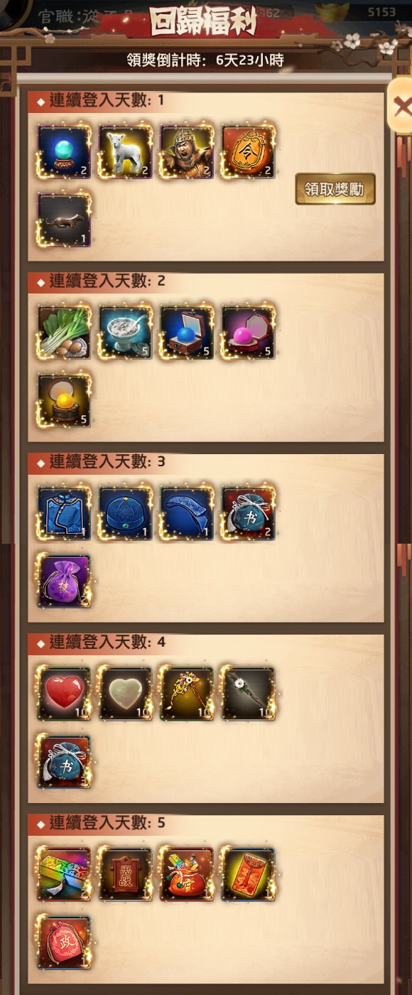 一段時間沒登入遊戲,再度登入遊戲時會有「回歸福利」,須連續多日登入來領取。