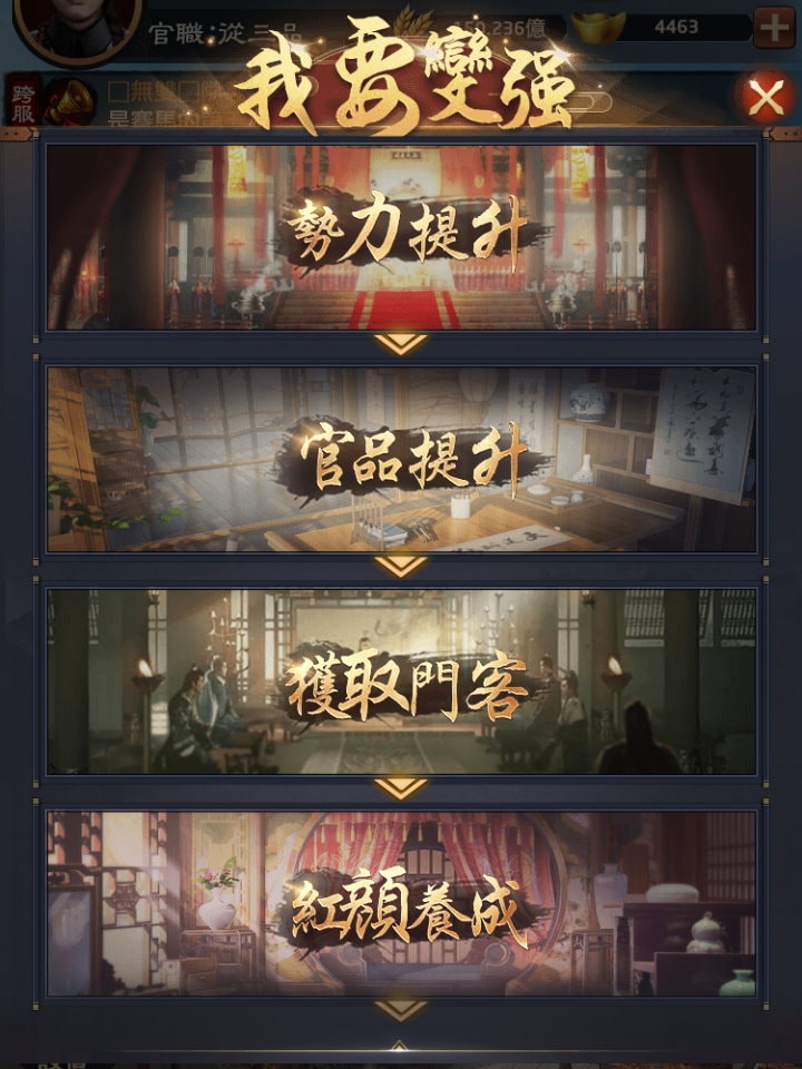 | 系統 | 官品 | 勢力 | 成就 | 道具 | 每日任務 | 主線任務 | 七日福利 | 一鍵功能 | 重歸仕途 | 版本更新 |