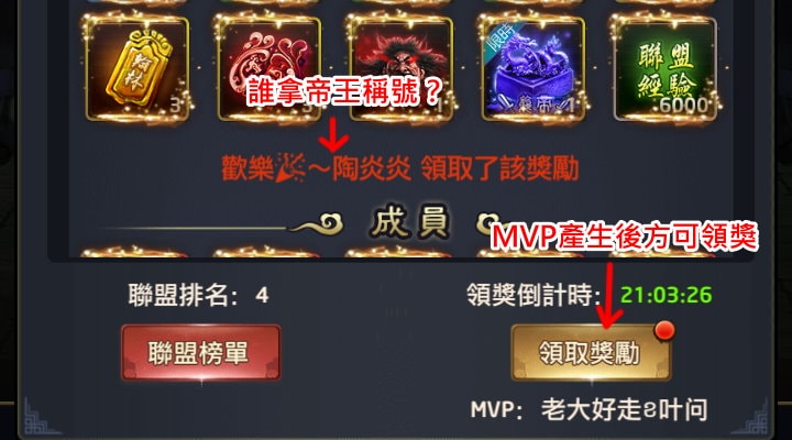 - 聯盟衝榜活動中,第1名的聯盟不是拿王就是帝,由誰拿會顯示在獎勵界面中。