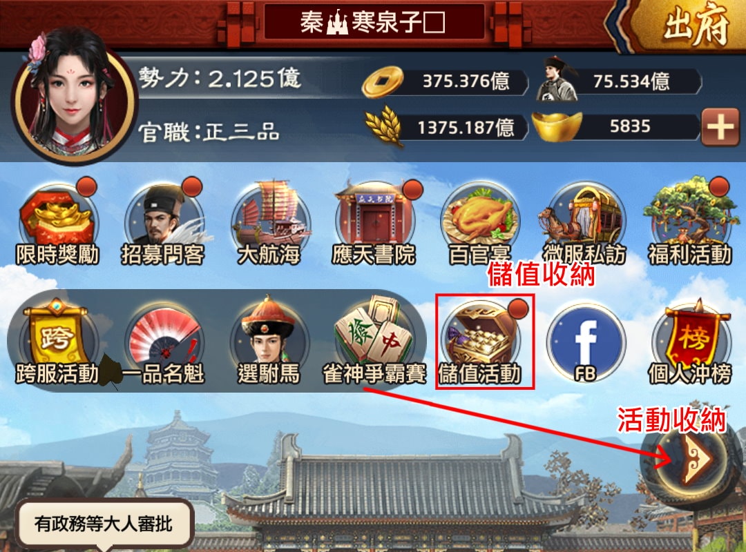 府邸界面,過多的衝榜與活動可收納(如上圖中,深色藍底的四個活動可收納)。