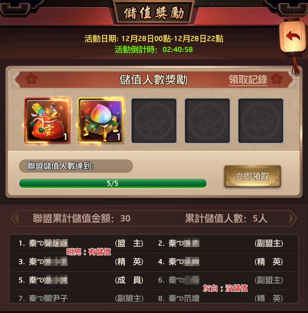 許多聯盟都會要求成員要「聯盟儲值」(中國版稱充值,簡稱盟充),以往只會顯示儲值人數、哪些人有儲值;改版後會列出所有成員資料,有儲值的以亮白字體顯示,沒儲值的以灰白字體顯示,很好找出是誰還沒儲值。