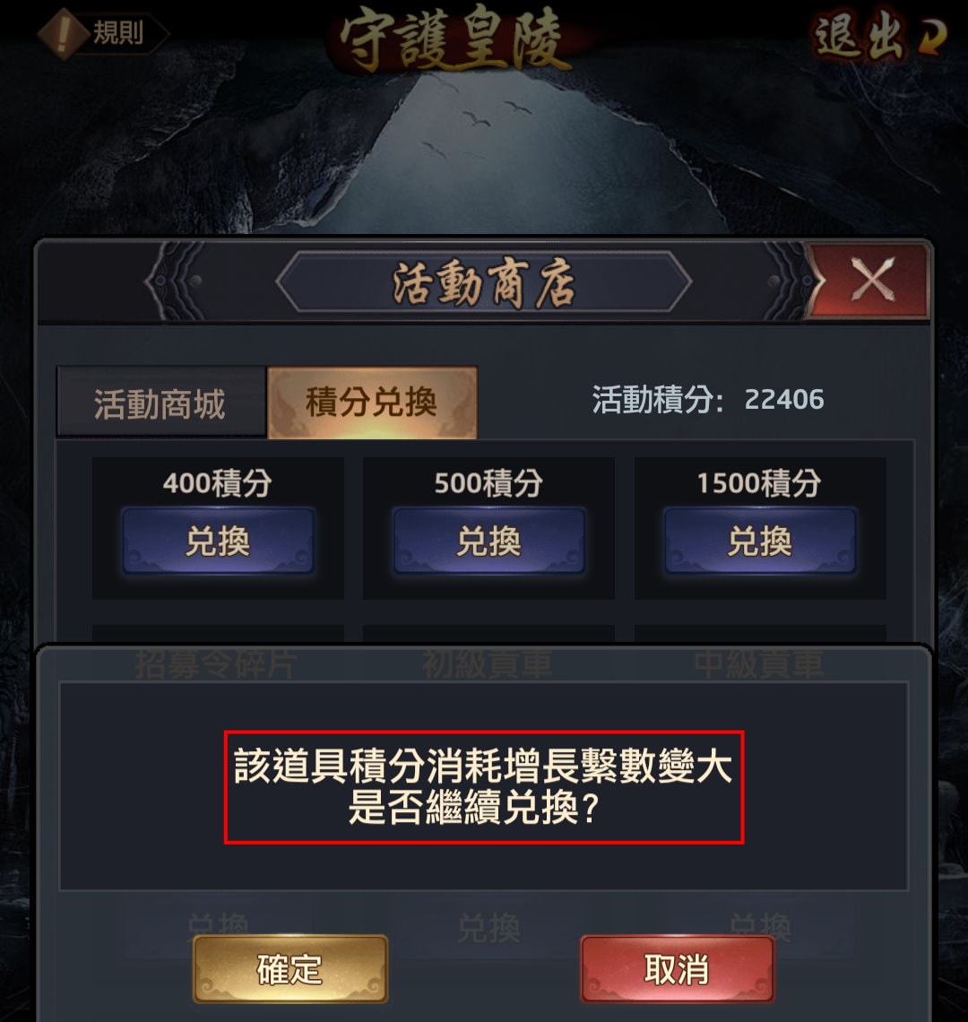 守護皇陵、皇陵爭霸賽的積分兌換,可兌換物品上限調整如下: