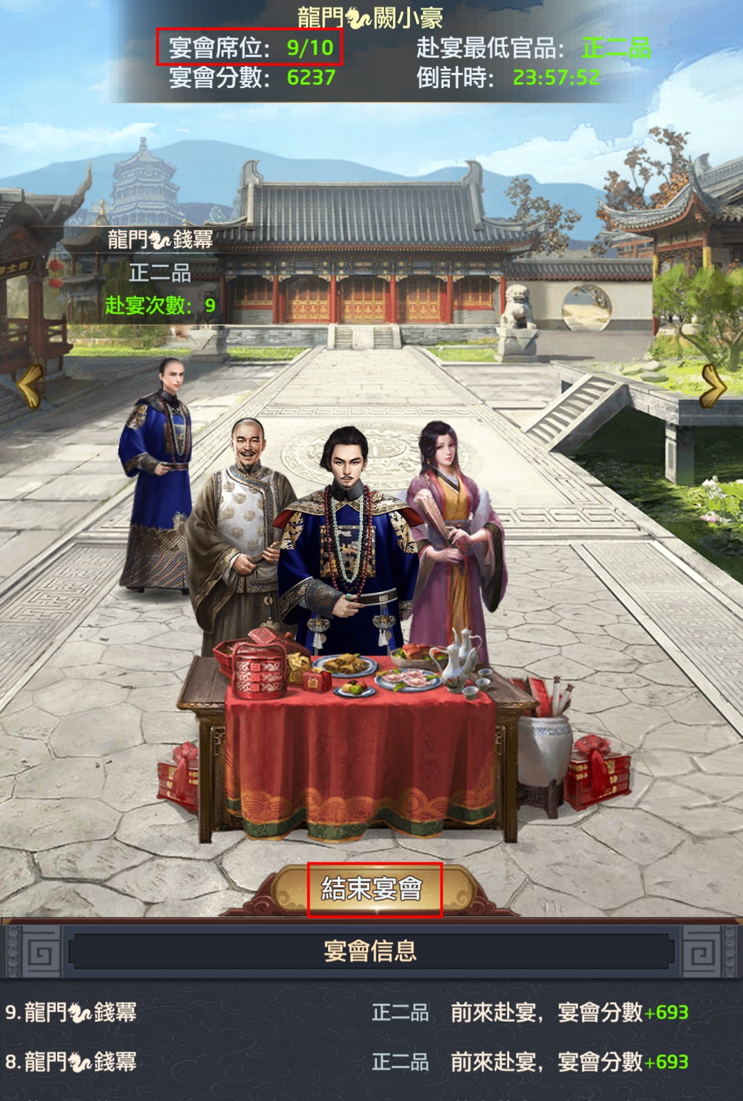 從七品可以開啟官宴,上個版本在「赴宴最低官品限制」最低可設為從七品,改版後最低就是正五品,低於正五品的都以正五品來計算: