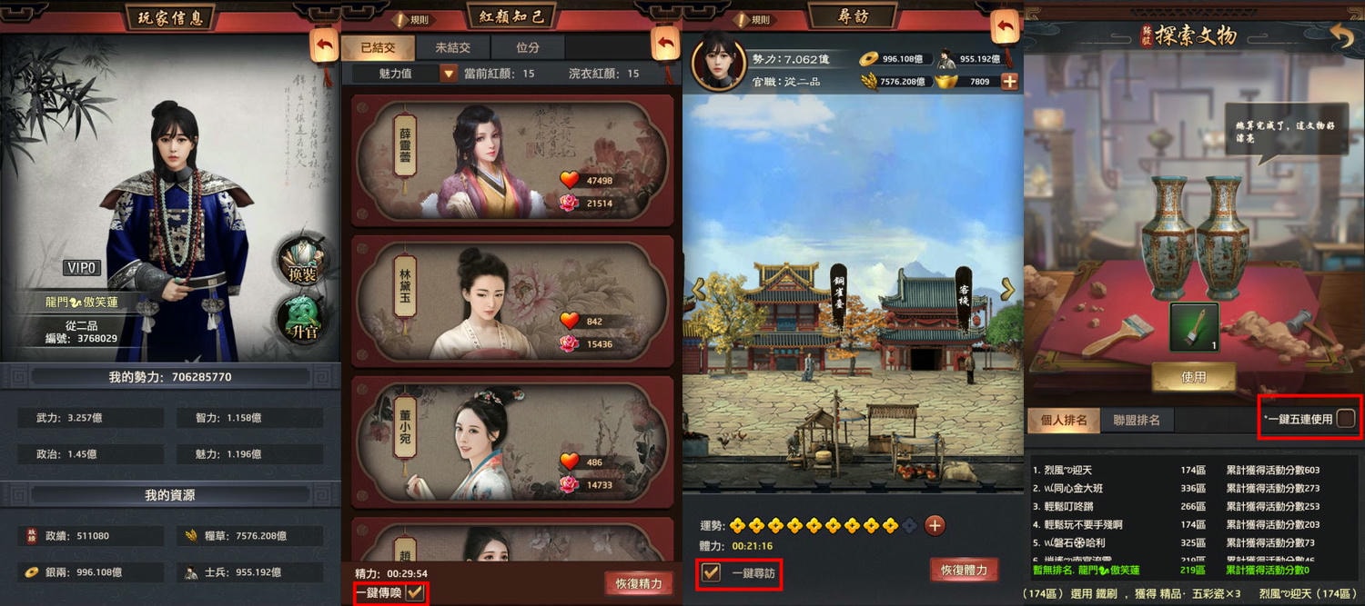 以前這三個功能都需要儲值到一定的VIP等級才能使用(改版後等級要求也沒調整),現在即使是VIP 0,在官品達到正五品後就一次開啟三個:一鍵五連、一鍵傳喚、一鍵尋訪