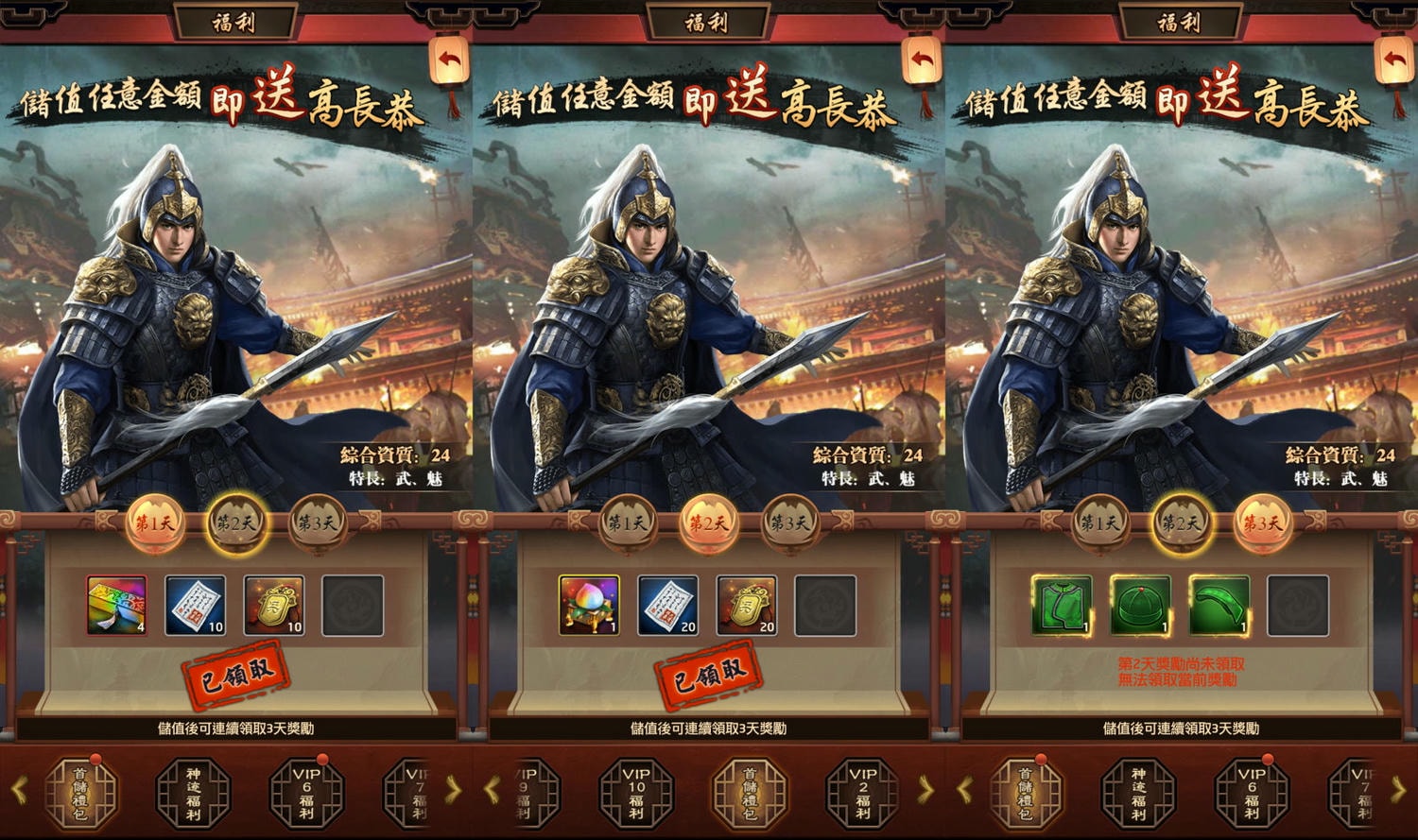 不過這個獎勵跟開服時的「七天福利」一樣,得照順序領,無法跳掉某一天,而高長恭應該是放在第1天的福利中。也就是說: