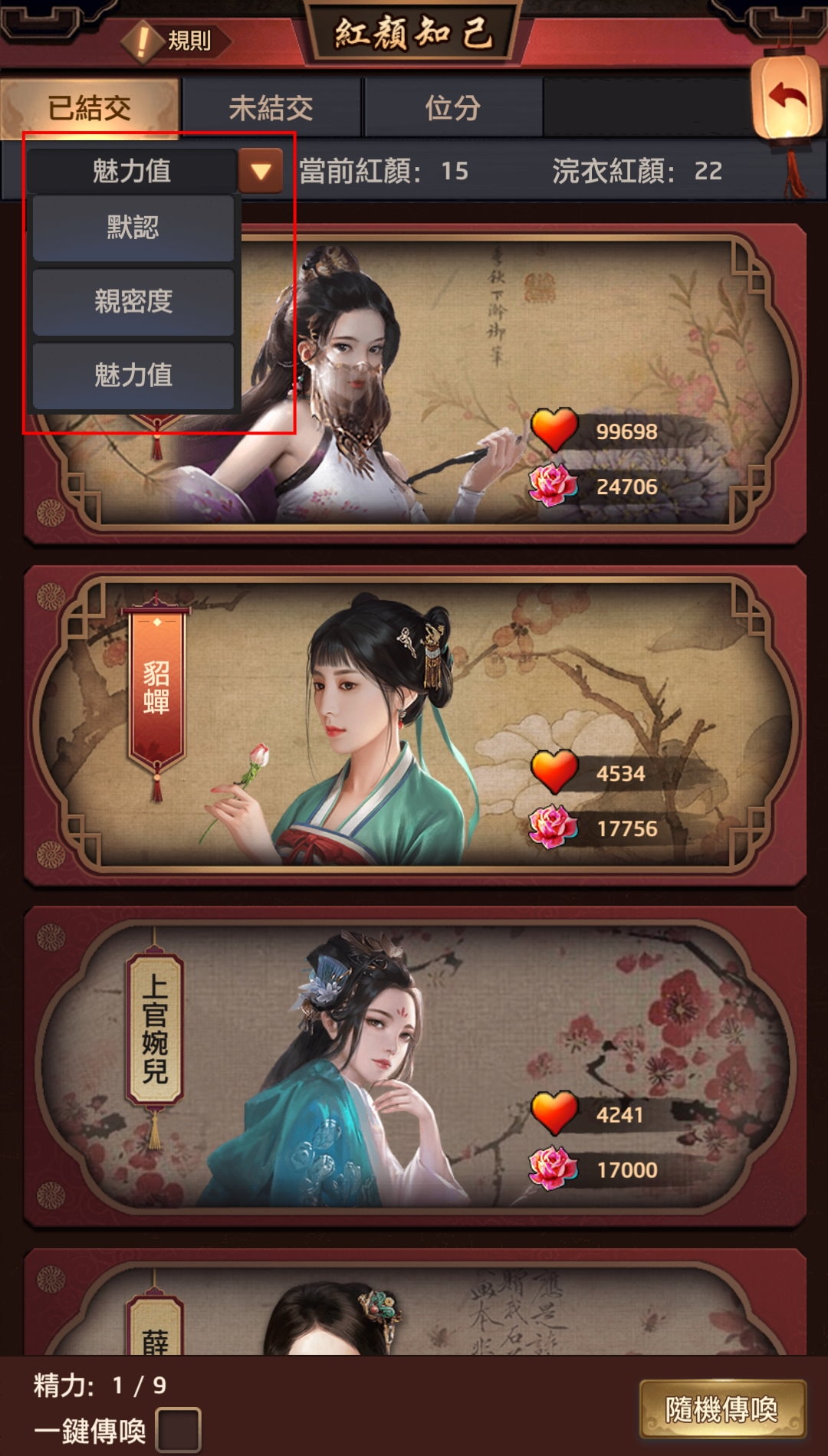 紅顏介面現在跟門客一樣可以使用排序功能,可按照「親密度」或「魅力值」來排列。