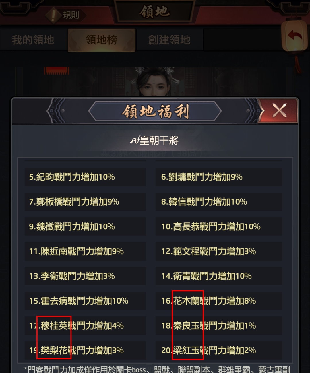 - 領地:門客戰鬥力加成新增巾幗五虎