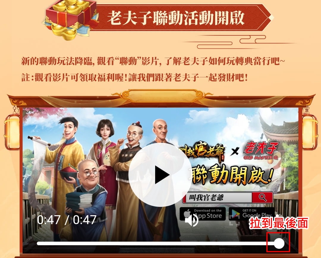 觀看影片獎勵,太早關閉廣告會領不到,可以直接把影片拉到47秒處領獎。(僅第一次觀看能領獎)
